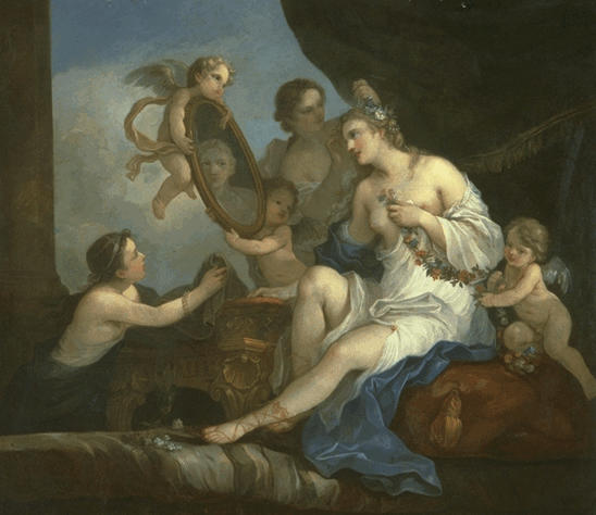 scène mythologique (toilette, Vénus, nudité : sein, couronne : fleur, putti, miroir, nymphe)