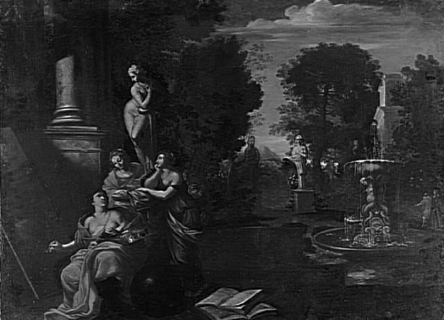 figure (allégorie : peinture, femme, assis, de trois-quarts, peinture, palette, femme, assis, de trois-quarts, jet d'eau, fontaine, statue) ; fond de paysage (jardin)