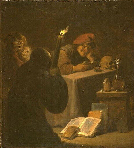 scène (lecture, sorcellerie, vieux, crâne, être fantastique, diable : Lucifer, torche, livre, pot, bol, bouteille, animal fabuleux)