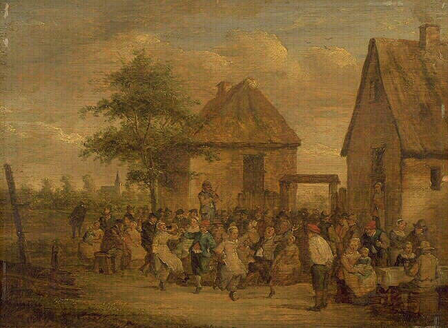 scène (fête champêtre, danse, divertissement, violon, chaumière) ; fond de paysage