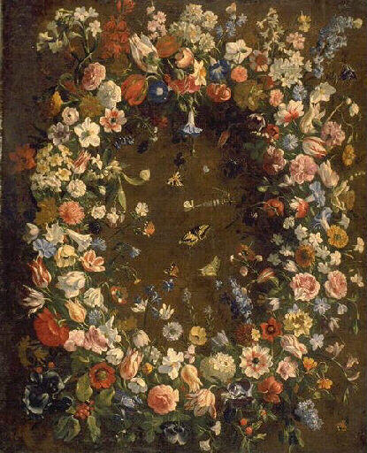 nature morte (couronne : guirlande, fleur, tulipe, anémone, narcisse, volubilis, jacinthe, bleuet, lilas, souci, pivoine, coquelicot, narcisse, souci, papillon)