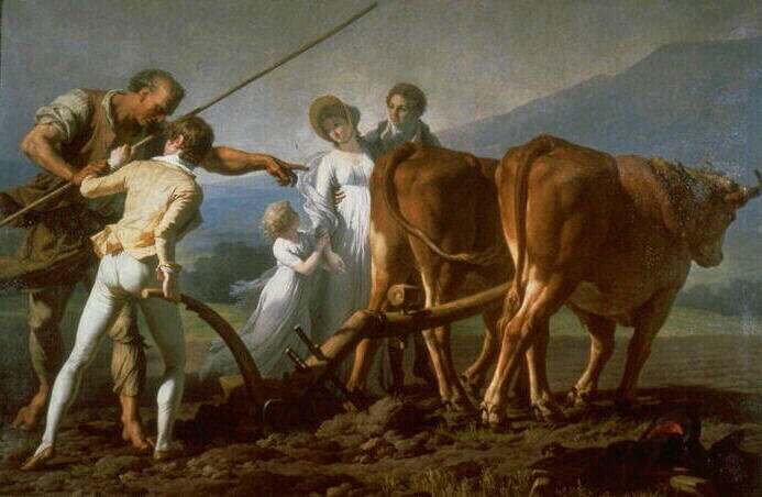 - STYLE Il s'agit d'une peinture à la fois idéalisant et réaliste - pour les boeufs et la charrue dont le modèle est fidèlement copié sur les araires du Languedoc -à l'opposé de l'antiquisant David et proche dans la forme et l'esprit (le côté moralisant) de Greuze. Il y a dans cette peinture à la fois du charme et de l'académisme .