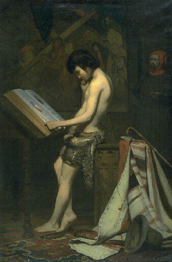 scène historique (Giotto, enfant, nudité, en pied, de profil, observation, enluminure, intérieur : atelier d'artiste, Cimabue, homme, peintre, palette)
