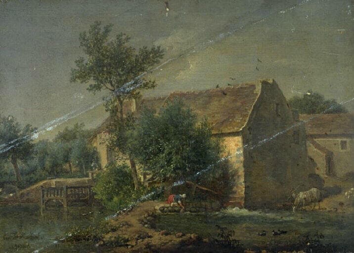 vue d'architecture (ferme, mare, feuillu) ; lessive ; moulin à eau ; boisson animale