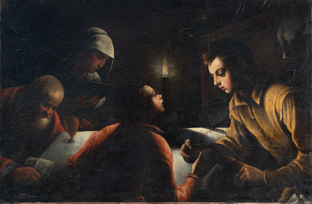 scène biblique (Jacob, don, récipient : lentille, Esaü, vieux, femme) ; chandelle ; effet de lumière ; cheminée