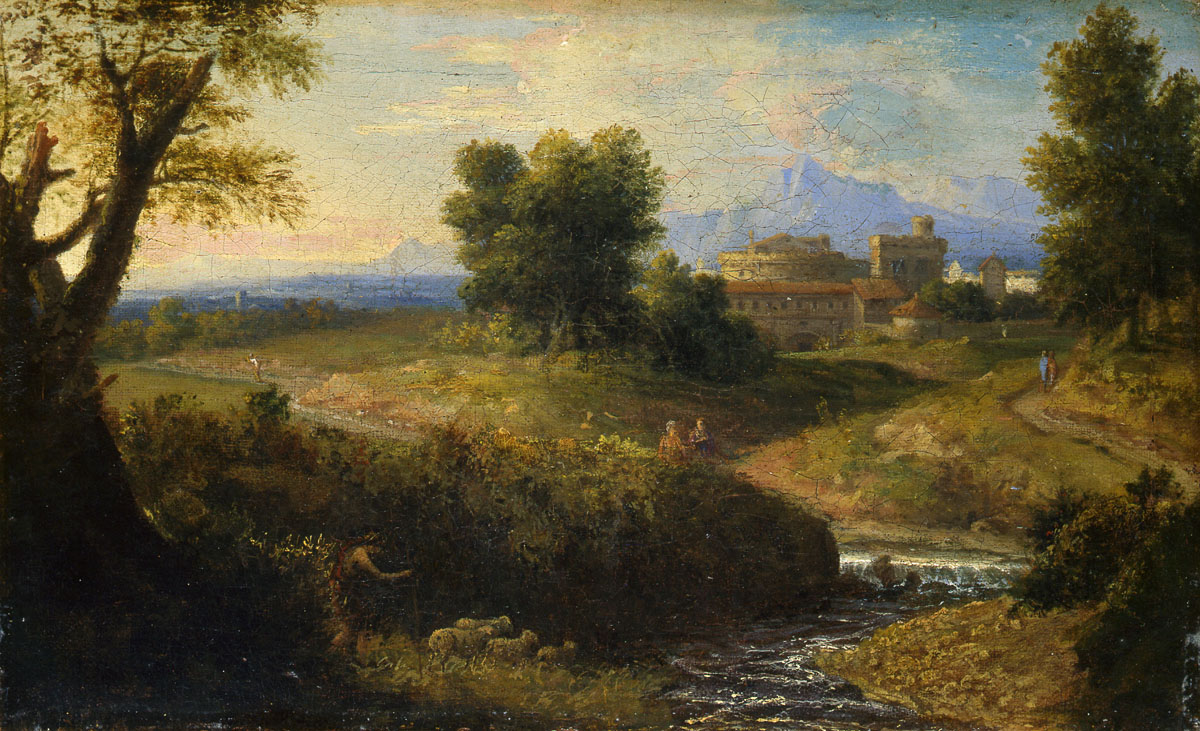 paysage (Latium, feuillu, chemin, cours d'eau, ville : fortification, montagne) ; homme (garde, mouton)