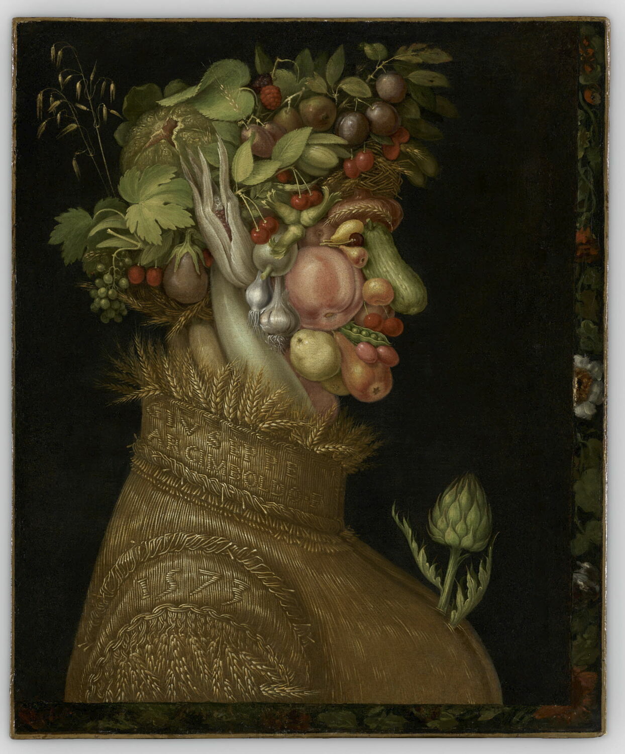 figure (allégorie : été, homme, en buste, de profil : fruit, cerise, artichaut, raisin, noisette, pois, légume, en buste, de profil)