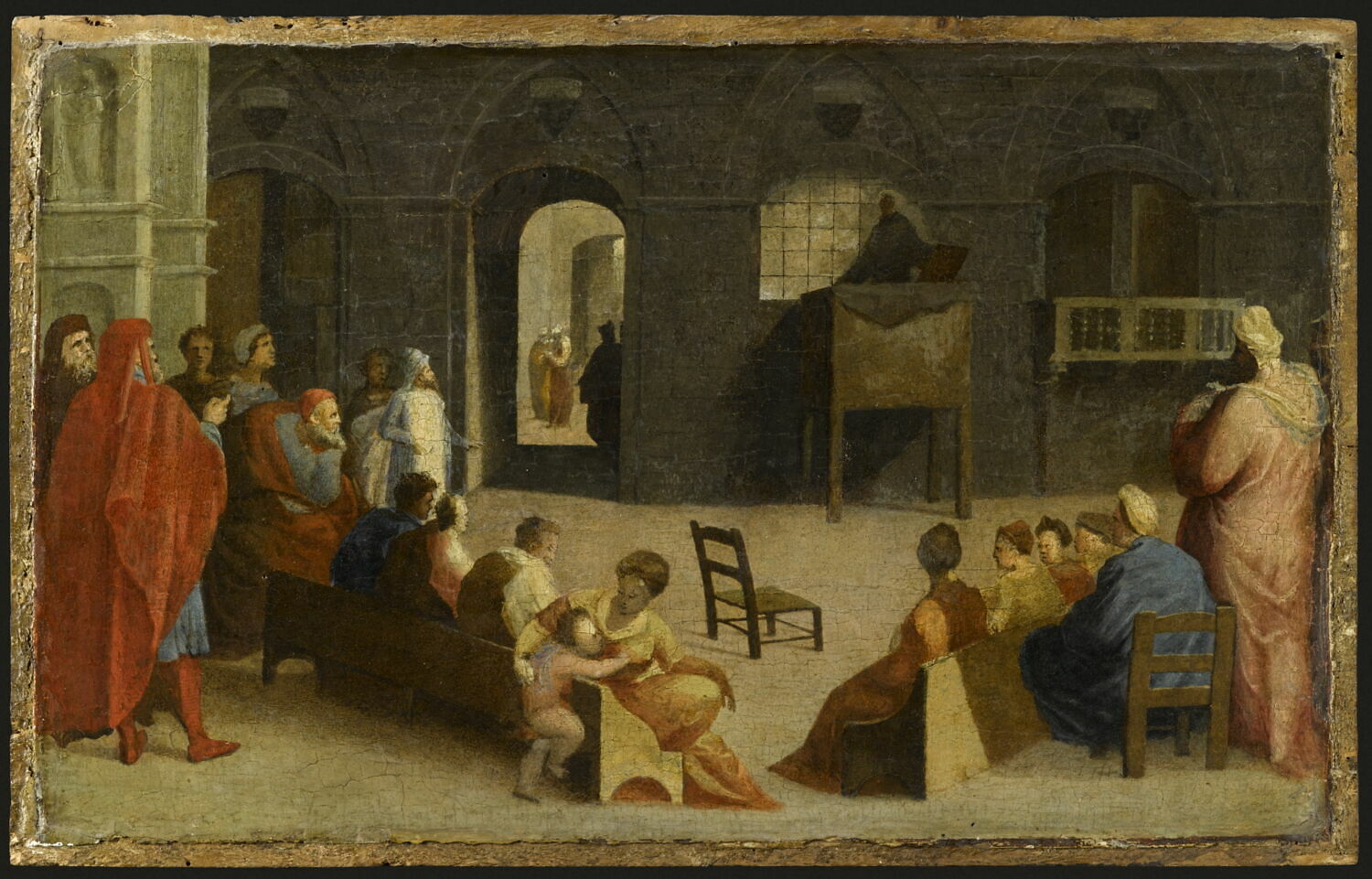 scène (saint Bernardin de Sienne, prédication, chaire à prêcher, personnage, chaise, banc) ; vue d'architecture
