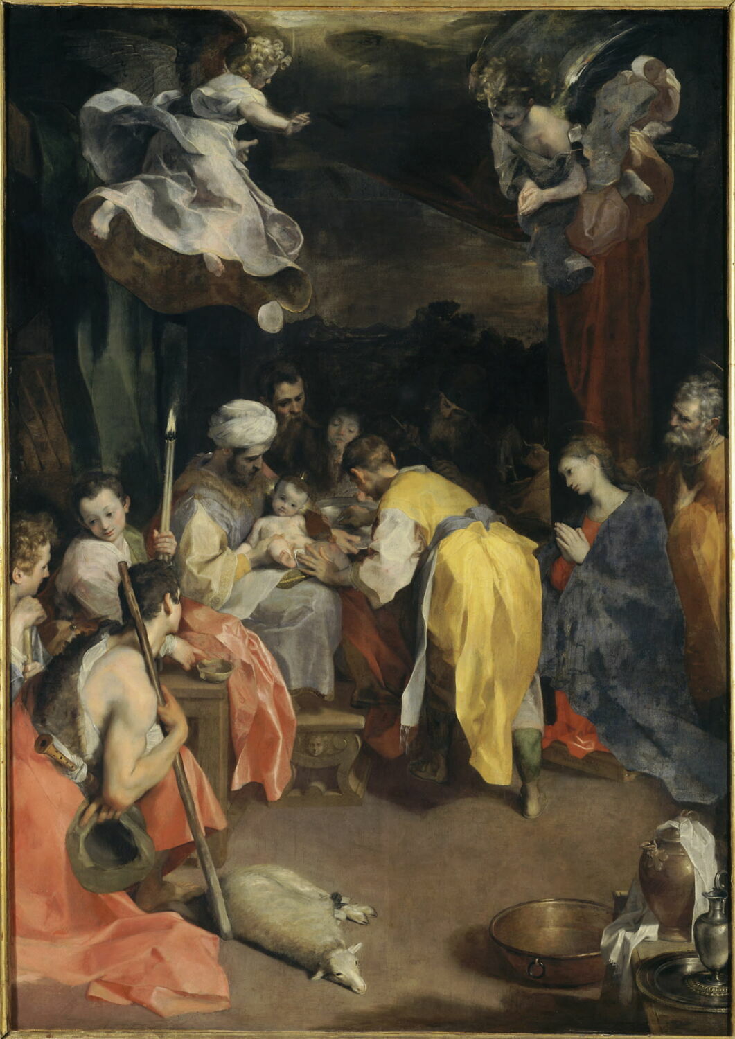 scène biblique (circoncision, berger, mouton) ; nature morte (aiguière, plat : cuivre) ; figures bibliques (ange, en vol)