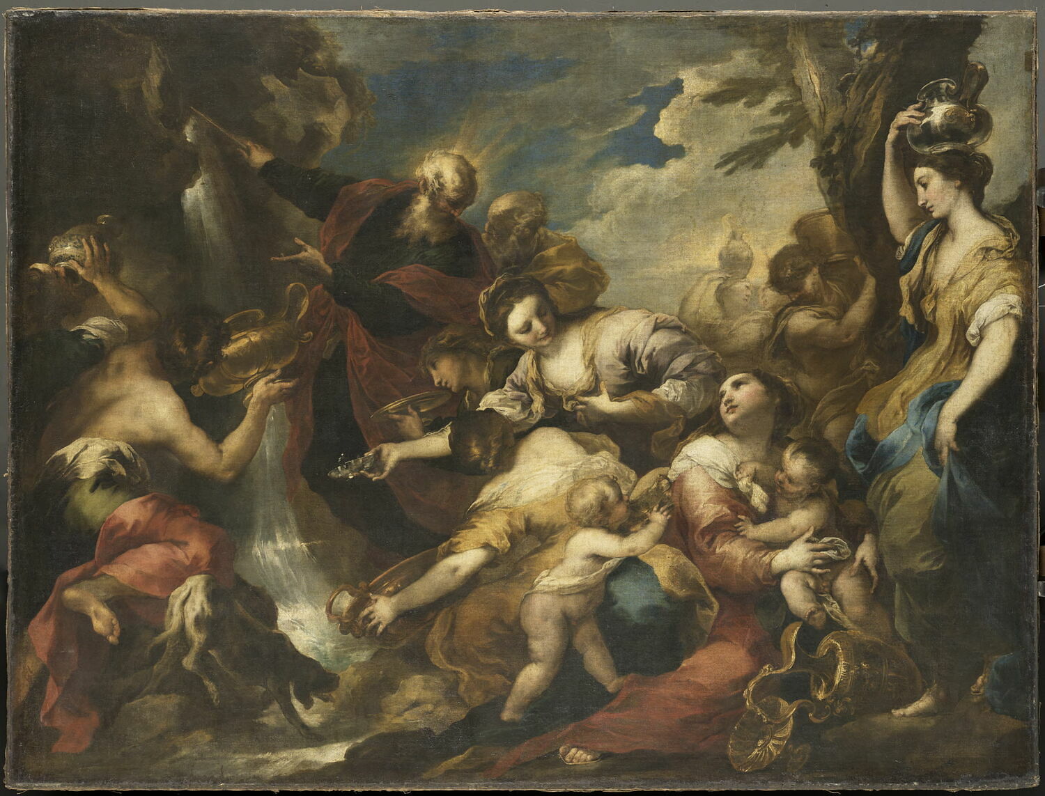 scène biblique (Moïse, prodige, rocher, eau, femme, enfant, récipient pour la boisson, vase)