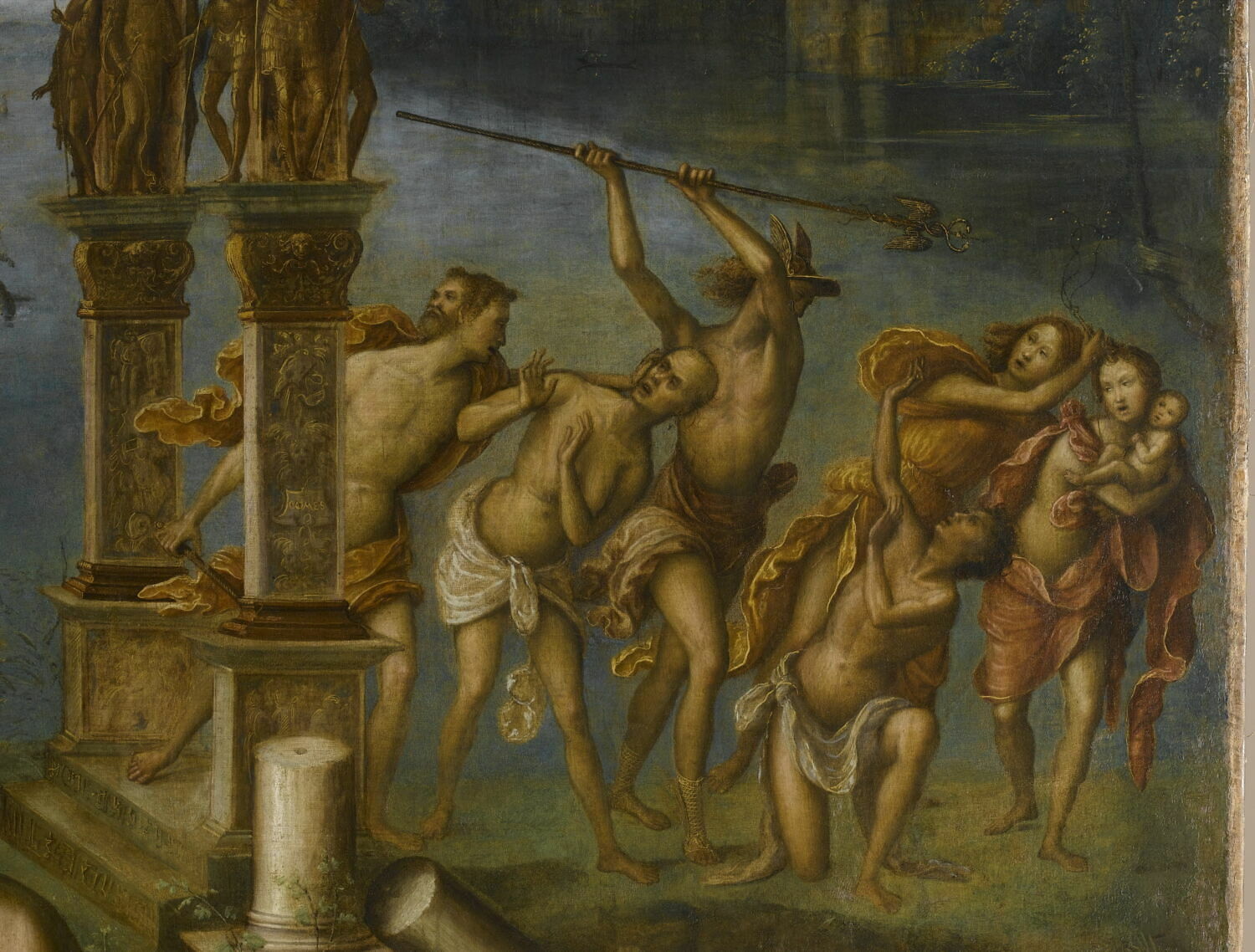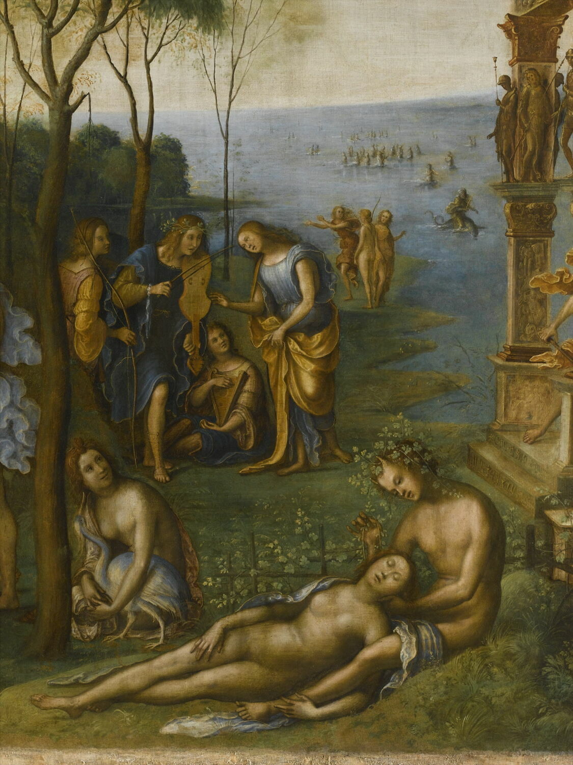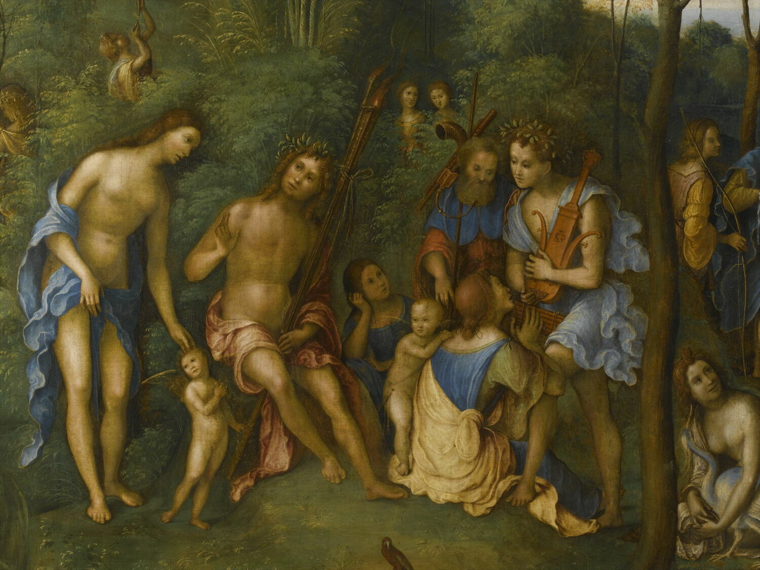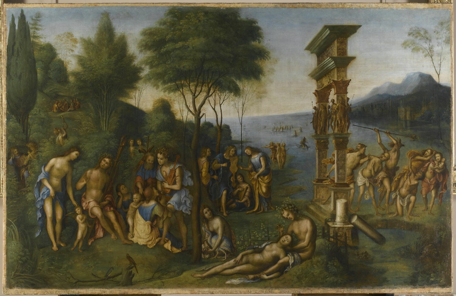 commandé en 1529-1530 par Isabelle d'Este pour son studiolo au palais ducal de Mantoue ; autres éléments de la décoration conservés également au Louvre : le pendant, allégorie des vices et allégorie des vertus par Corrège, allégorie de la cour d'Isabelle d'Este par Lorenzo Costa, Mars et Vénus dit le Parnasse par Mantegna, le combat de l'Amour et de la Chasteté par Pérugin