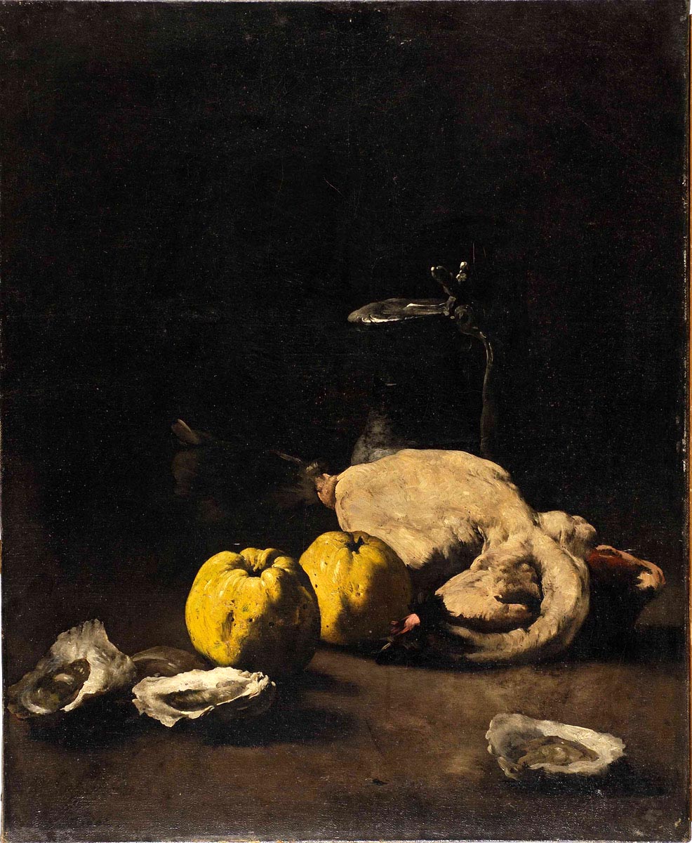 nature morte (poule, huître, pomme, récipient : étain, effet de lumière)