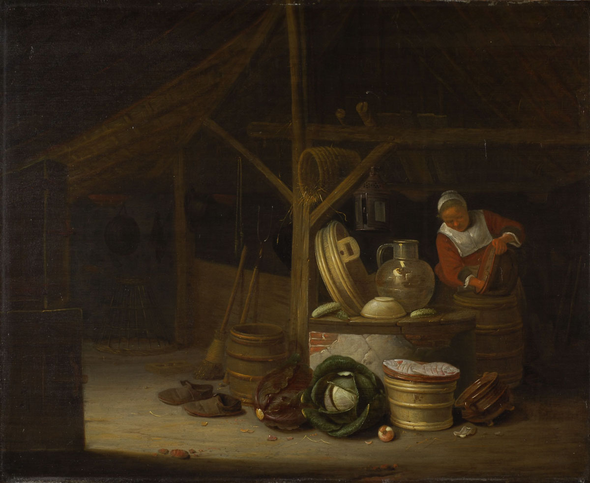 scène (intérieur, femme, ménage, récipient : cuivre, récipient : bois, récipient : céramique, récipient : vannerie, chou, cornichon, balai, chaussure, effet de lumière)
