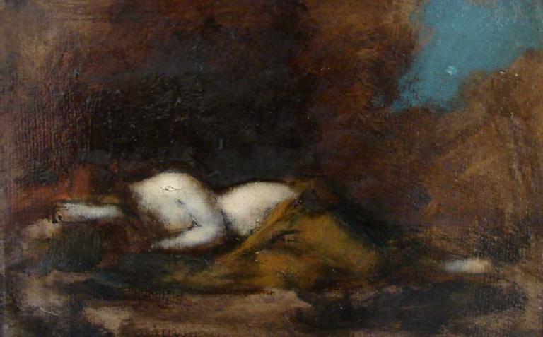 figure (femme, couché, nudité : poitrine, tristesse) ; fond de paysage