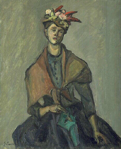 portrait d'inconnu (femme, assis, de face, à mi-corps, vêtement, chapeau : fleur) ; nature morte (vase, bouquet, fleur)
