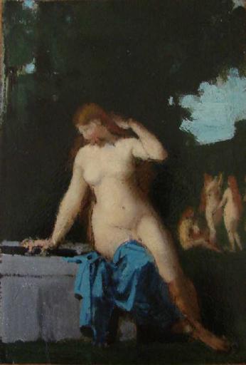 figure (à l'antique, femme : nu, assis : fontaine, de face, tête : de profil, effet de tissu, bras : replié : cheveux) ; groupe de figures (femme : nu, assis, de profil, en pied, de dos, de trois-quarts) ; fond de paysage