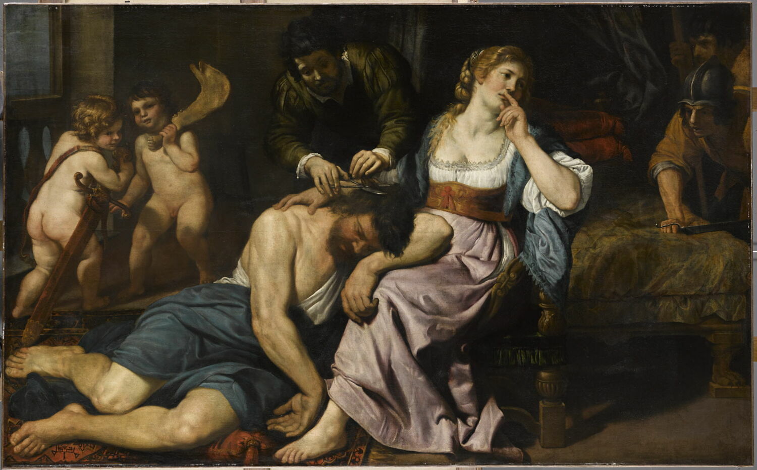 scène biblique (Samson, sommeil, Dalila, femme, serviteur, cheveux, putti, épée, âne, squelette d'animal, soldat, Philistin)