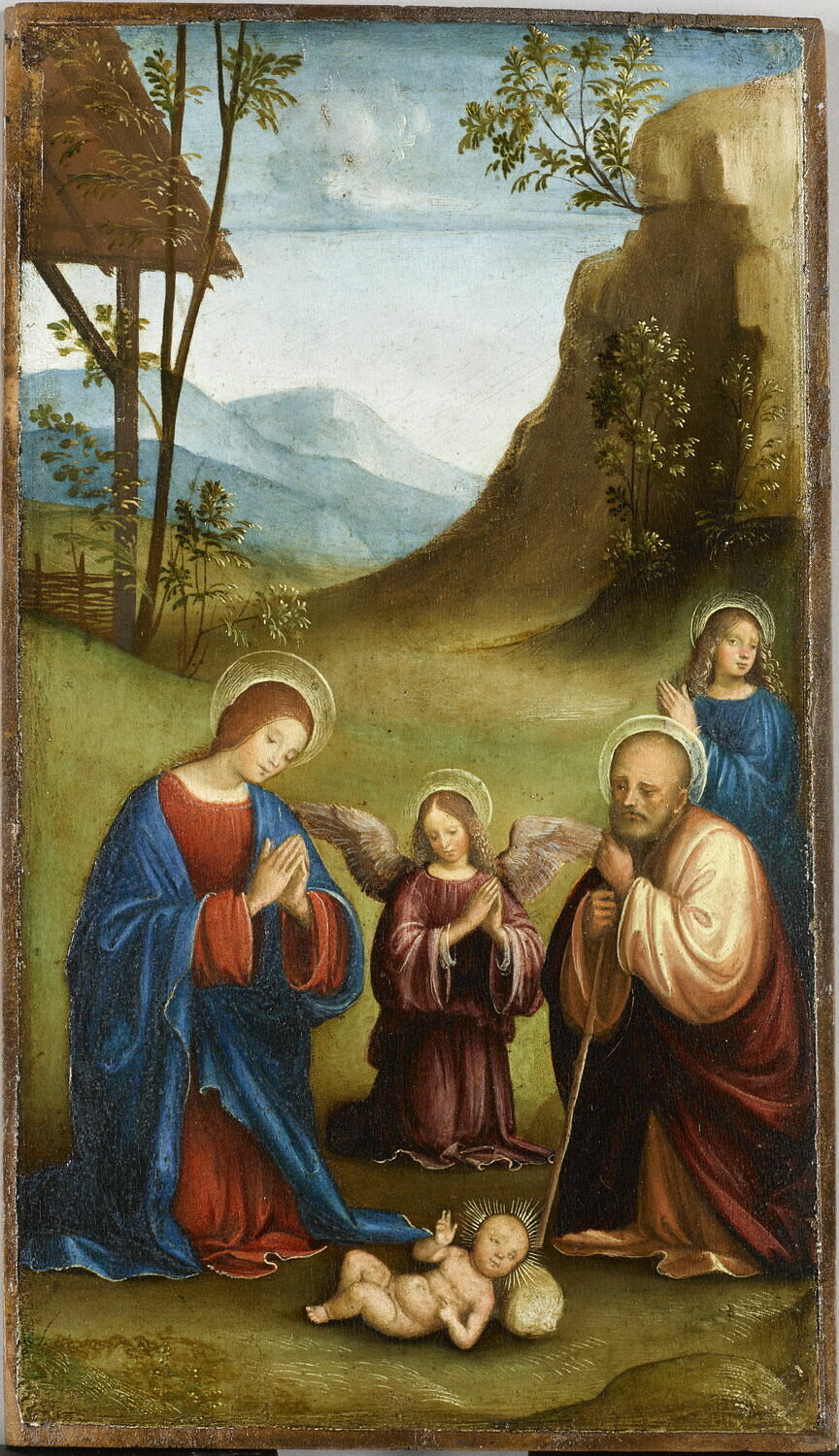 scène biblique (Nativité, ange) ; fond de paysage