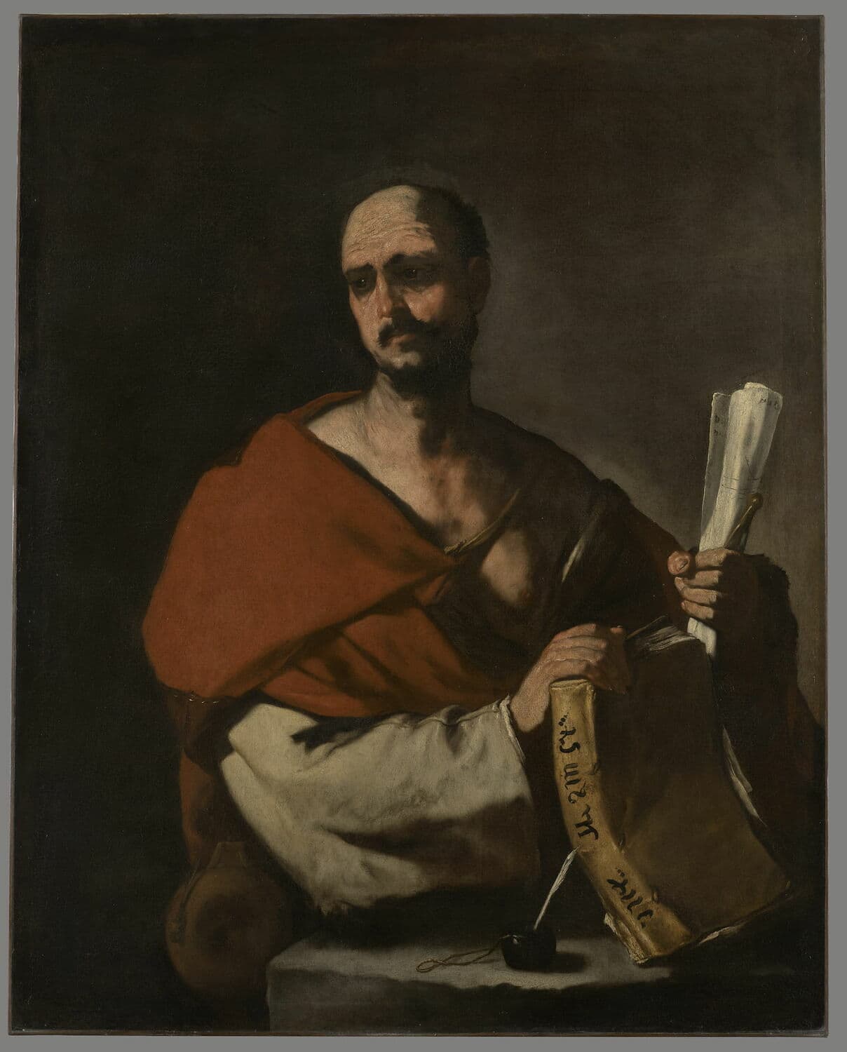 PHILOSOPHE TENANT UN LIVRE ET UN ROULEAU DE PAPIER