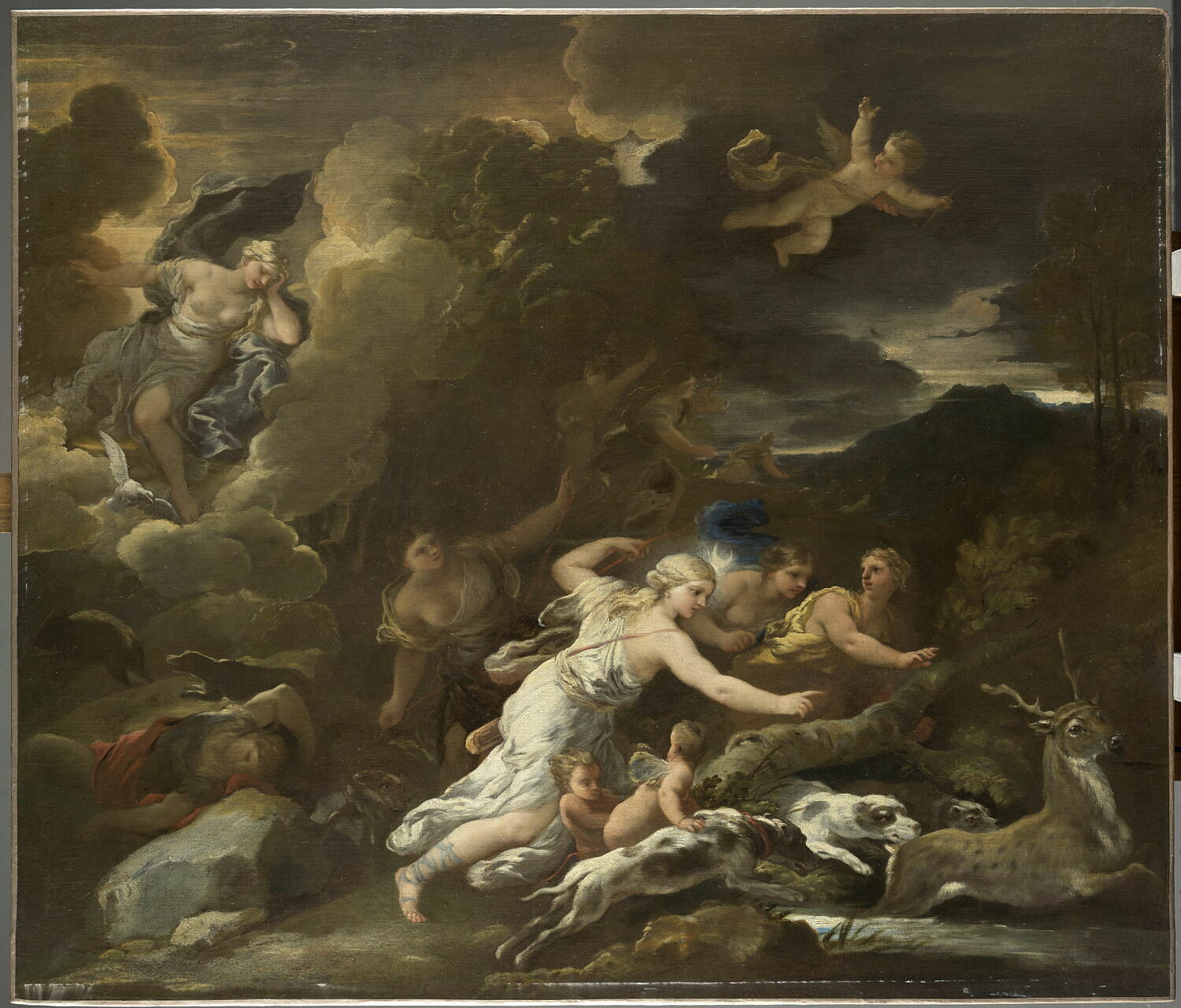 scène mythologique (Diane, chasse, chien, cerf, Vénus, nudité : sein, nuée, putti) ; fond de paysage (ciel, nuage, forêt)