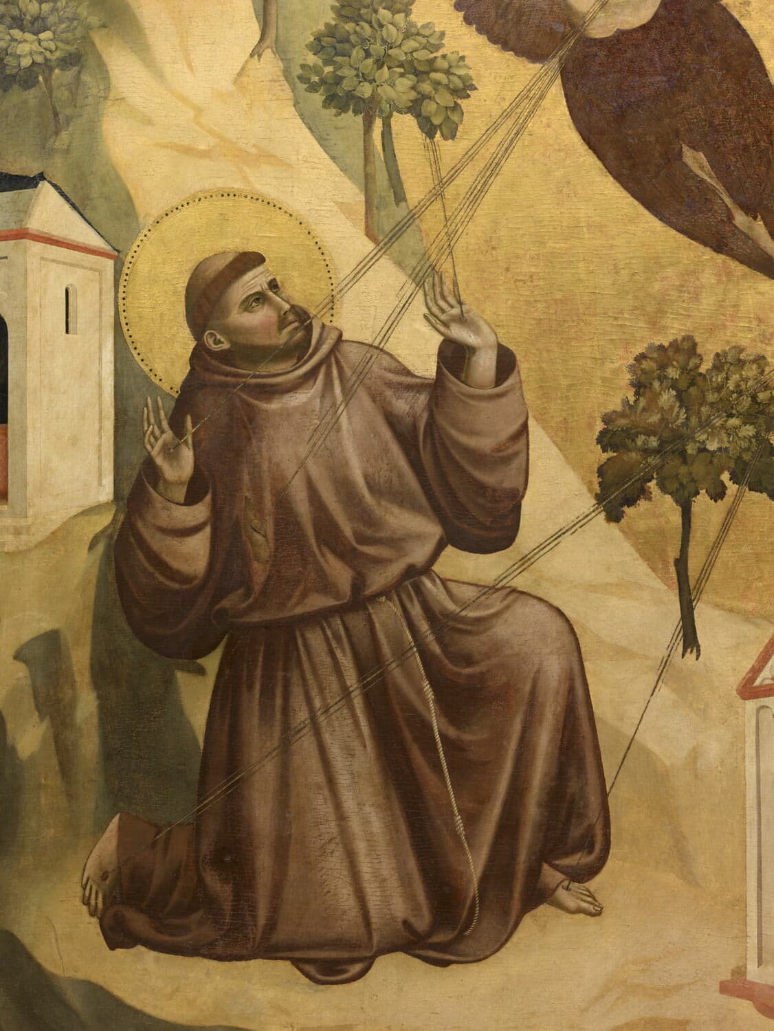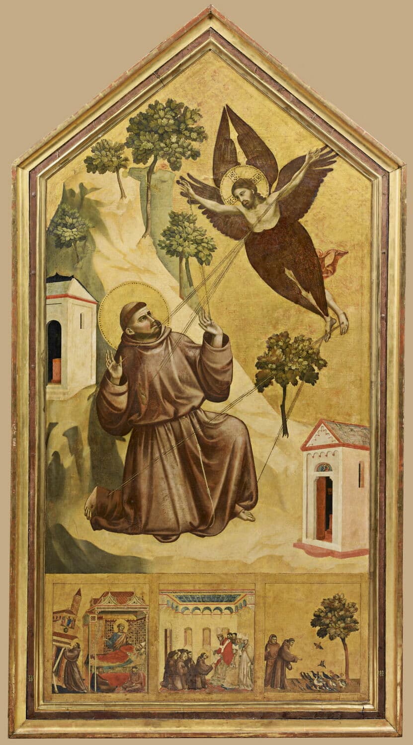 SAINT FRANCOIS D'ASSISE RECEVANT LES STIGMATES ; PREDELLE : LA VISION DU PAPE INNOCENT III ; LE PAPE APPROUVANT LES STATUTS DE L'ORDRE ; SAINT FRANCOIS PRECHANT AUX OISEAUX