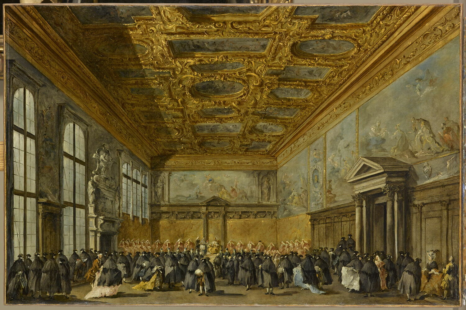 scène historique (audience, Mocenigo Alvise IV, spectateur) ; vue d'intérieur (Venise, palais, salle, décor d'ameublement, plafond, fenêtre)