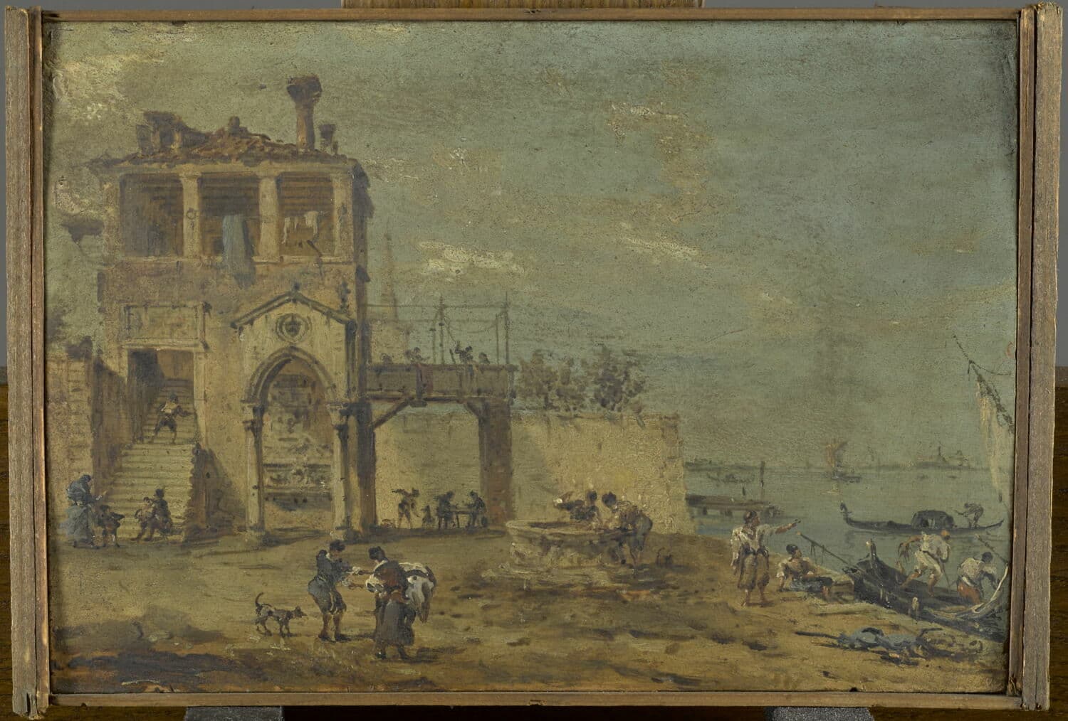 pendant du paysage vénitien avec tour de guet et deux maisons basses au bord d'un lac, également conservé au Louvre (RF 1970 43)