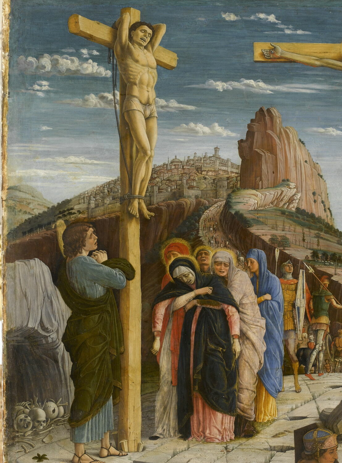 scène biblique (Crucifixion, Pâmoison de la Vierge, Les larrons, soldat, cheval, cuirasse, à l'antique, tunique, crâne, os) ; fond de paysage (rocher, montagne, ville, ciel, feuillu)