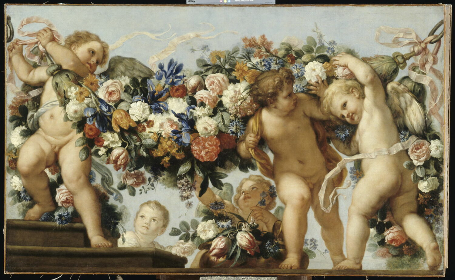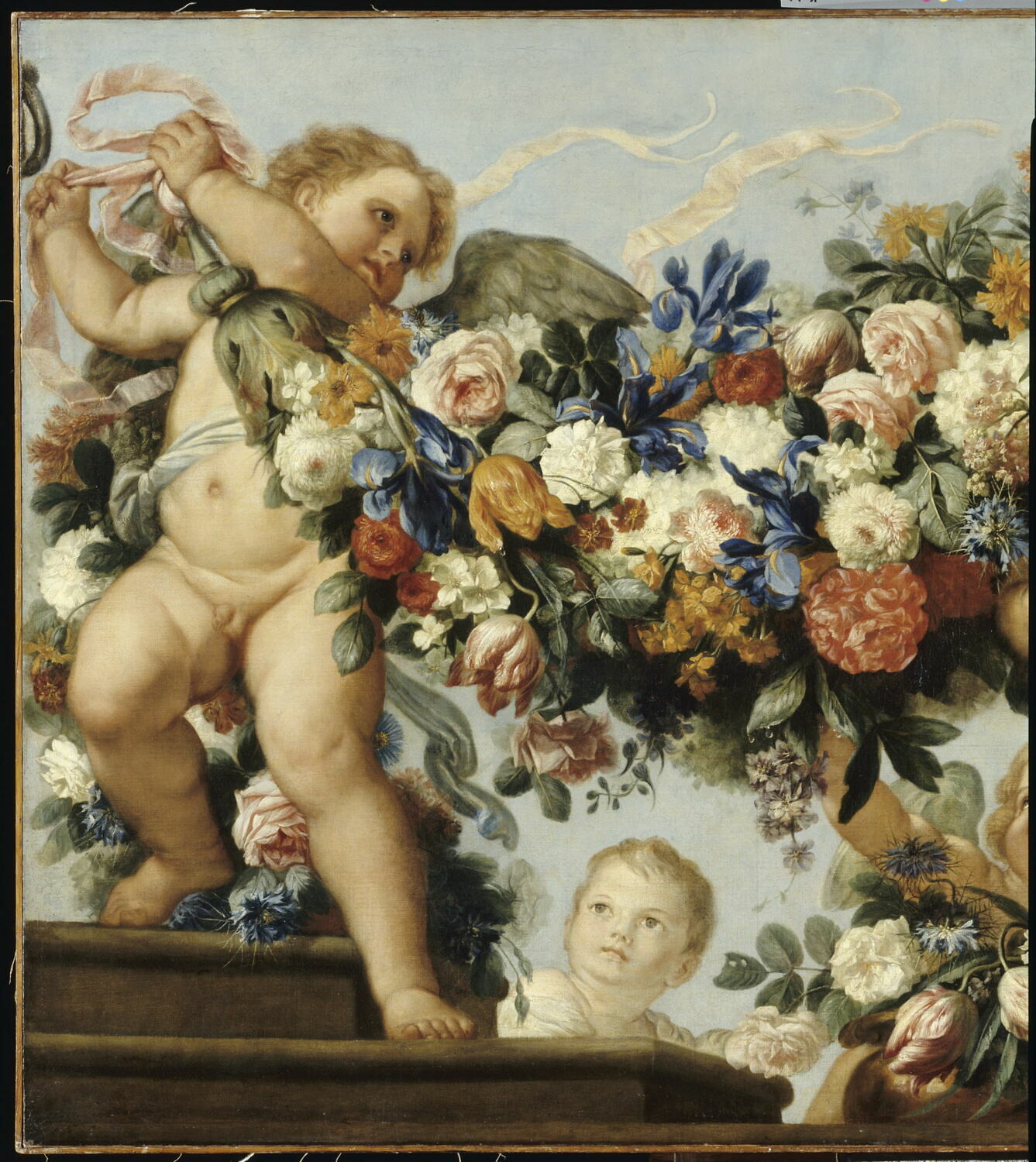 scène (putti) ; nature morte (guirlande : fleur, rose, pivoine; iris, tulipe)