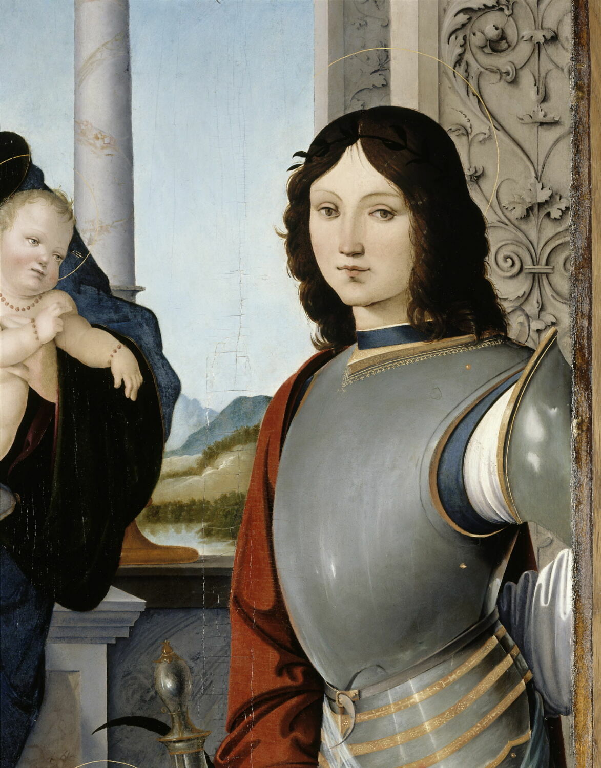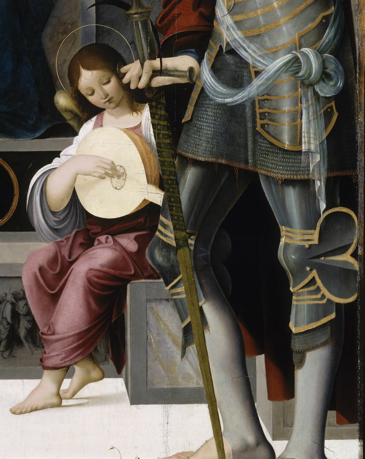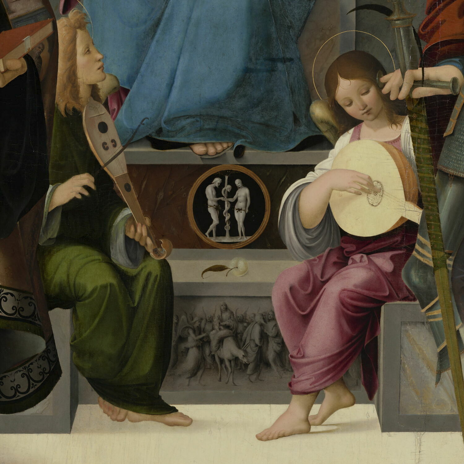 figures bibliques (Vierge à l'Enfant, Enfant Jésus : nu, assis, trône, ange, mandoline, ?, cordophone, loggia, colonne, pilastre, peinture) ; figures bibliques (Adam, Eve) ; scène biblique (Entrée à Jérusalem) ; groupe de figures (saint Benoît de Nursie, en pied, Bénédictin, chape, crosse, saint Quentin, armure, épée) ; fond de paysage