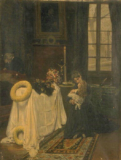 scène (intérieur, femme, veuf, agenouillé, baiser : front, fillette, orphelin, homme, larmes, uniforme : mort, lit, crucifix, chandelle : objet du culte) ; chambre (meuble, matériel d'écriture, tableau, effet de tissu) ; fond de paysage (fenêtre, feuillu, hiver)