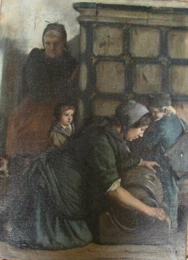 scène (paysan, pressurage : beurre, jeune fille, vieille, garçon, fillette, chat, mur) ; portrait collectif (Henner Marie Anne, jeune fille, de profil, agenouillé, Henner Madeleine, vieille, de face, assis) ; figure (homme, tête, de profil)