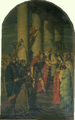 scène historique (baptême d'adulte, catholicisme, Clovis Ier, saint Remi de Reims, sainte Clotilde, soldat, idole : paganisme)