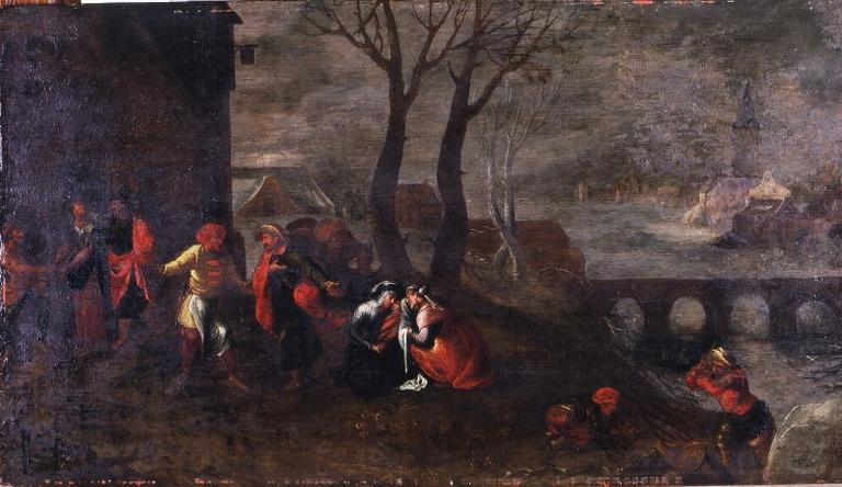 scène biblique (fuite en Egypte) ; paysage (abattage d'arbre : feuillu, cours d'eau, village)