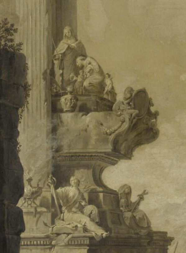 réduction réalisée par Pittoni en 1741 d'après un tableau conservé dans une collection particulière de Liverpool (Zava Boccazzi, 83) , qui appartient à une série de vingt quatre toiles sur le thème des tombeaux d'hommes illustres commandées entre entre le 1er novembre 1726 et le 25 février 1727 par l'irlandais Owen Mc Swiny et destinées à Lord March, futur duc de Richmond ; les toiles furent peintes par des artistes bolonais et vénitiens ; le tableau de Liverpool achevé en 1726 est l'oeuvre de G.B. Cimaroli (pour le paysage) , Canaletto (pour les architectures) et Pittoni (pour les figures) ; la réduction a été exécutée en vue de la publication d'un recueil de gravures de Nicolas Dauphin de Beauvais, publiées sous le titre français : tombeau des princes, grands, capitaines et autres hommes illustres qui ont fleuri dans la Grande-Bretagne vers la fin du XVIIe siècle et le commencement du XVIIIe siècle