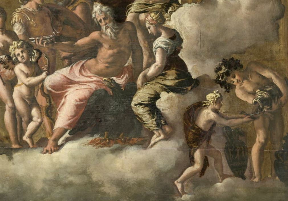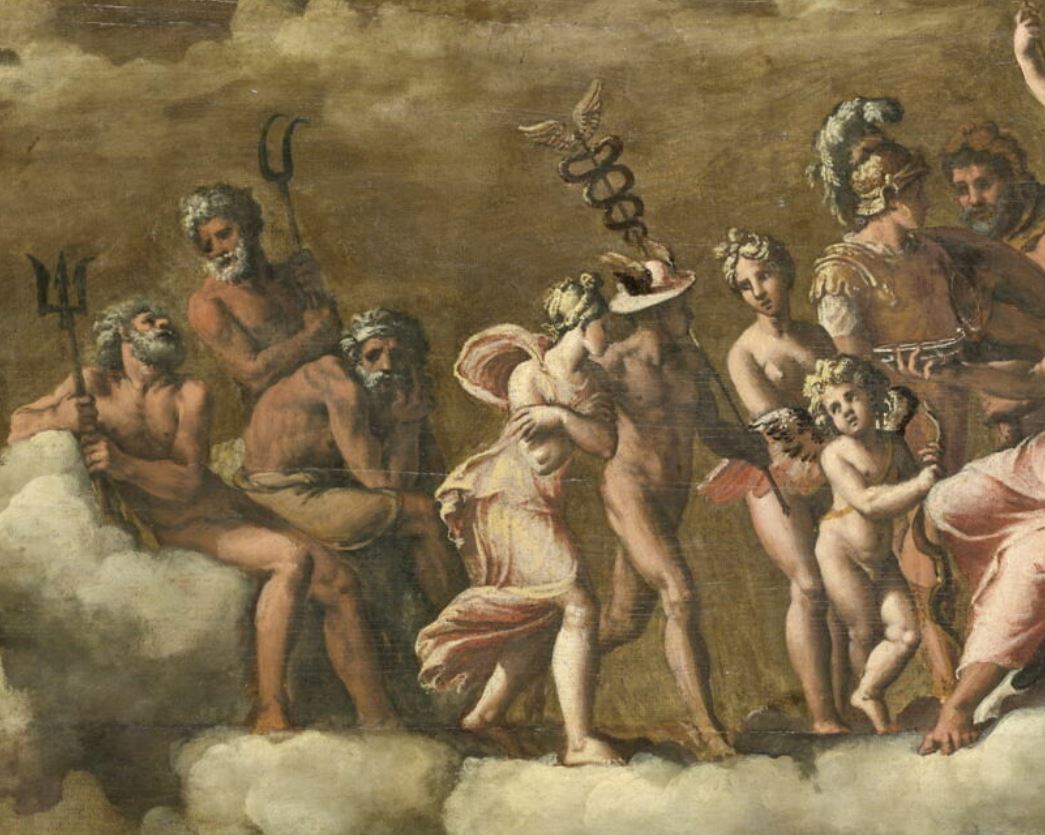scène mythologique (Psyché, Mercure, attribut : caducée, attribut : pétase, Jupiter, Ganymède, Bacchus, réunion, nuée, vase, à l'antique)