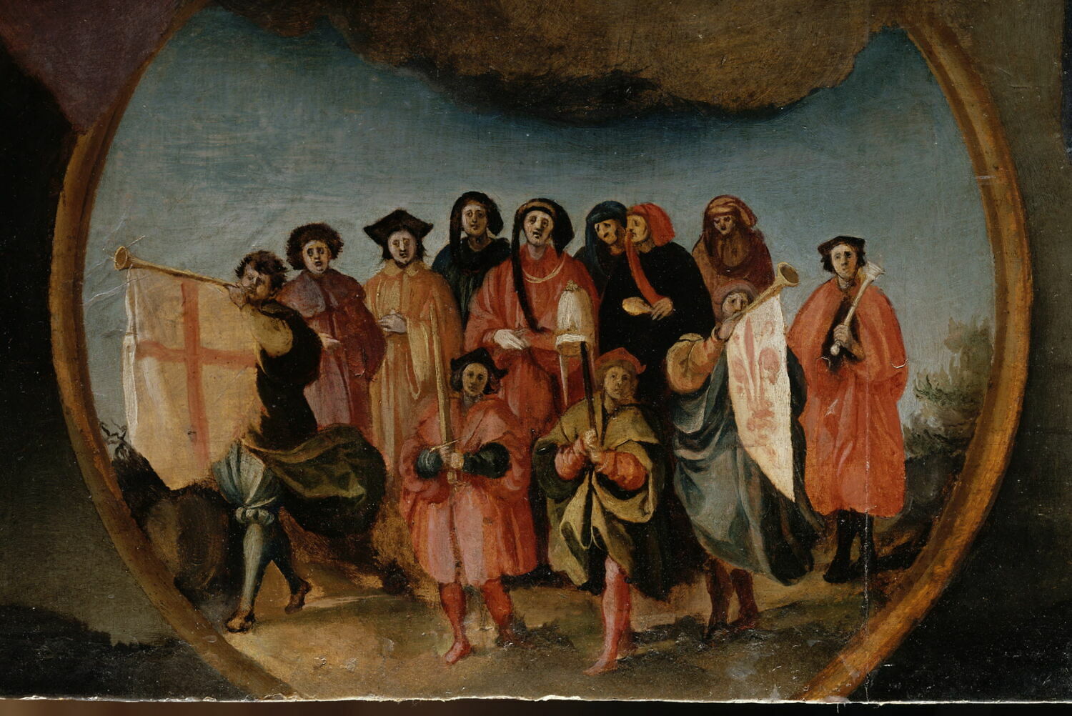 figures bibliques (sainte Anne Trinitaire, assis, Enfant Jésus : nu, saint Pierre, saint Benoît de Nursie, Bénédictin, saint Sébastien, Le bon larron, en pied, peinture) ; peinture (scène, procession, commémoration, musicien, instrument à embouchure)