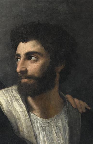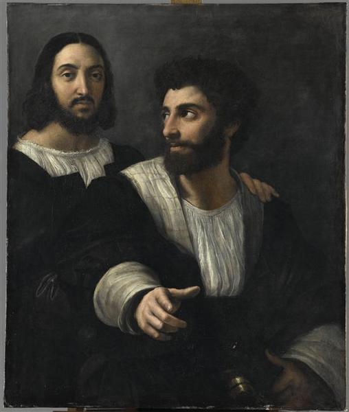portrait collectif (Santi Raffaello, homme, en buste, de face, homme, assis, de trois-quarts, épée, barbe, peintre, Italien) ; autoportrait (Santi Raffaello, homme, à mi-corps, de face, peintre)