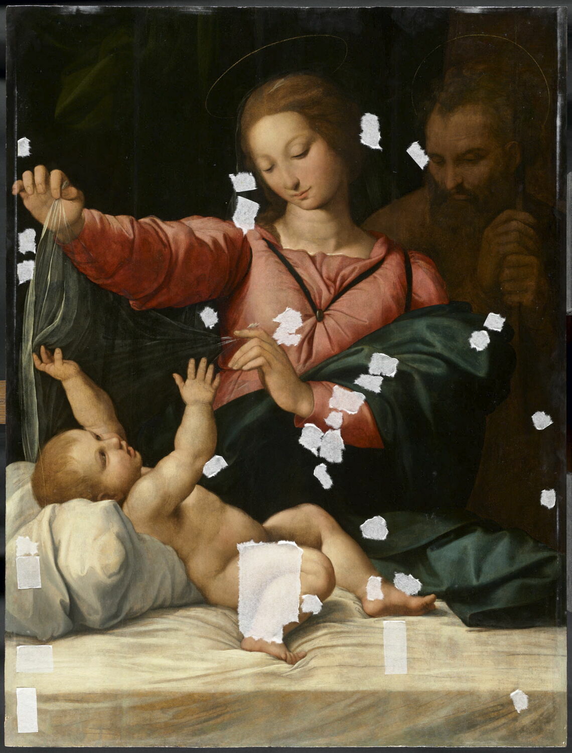 figures bibliques (Sainte Famille, Enfant Jésus : nu, couché, draperie, lit)