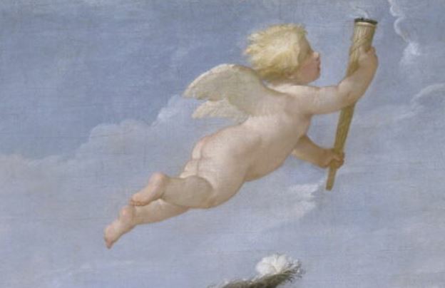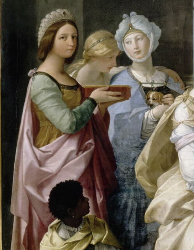 scène mythologique (Pâris myth, Hélène, enlèvement, bichon, singe, enfant, Noir, Eros, torche, symbole, amour, serviteur, cuirasse, putto) ; fond de paysage (mer, bateau à voiles)
