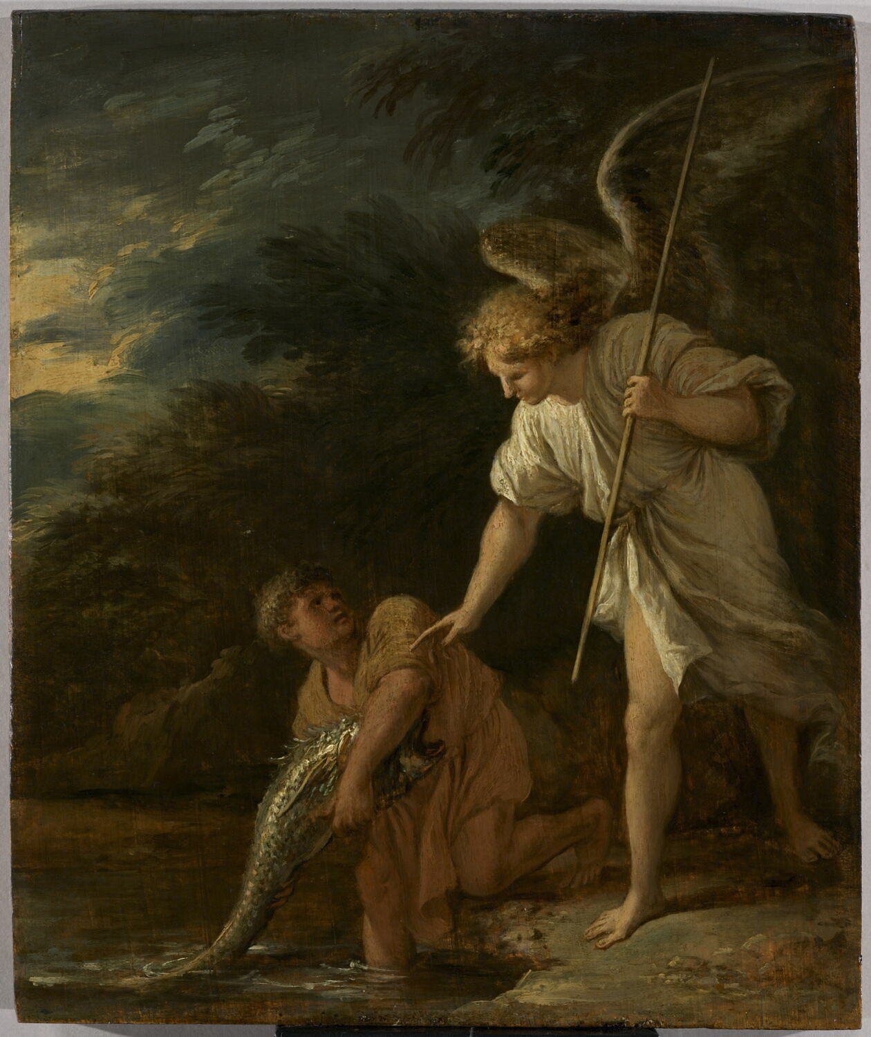scène biblique (Tobie, Raphaël, pêche, poisson, tigre) ; fond de paysage (feuillu)