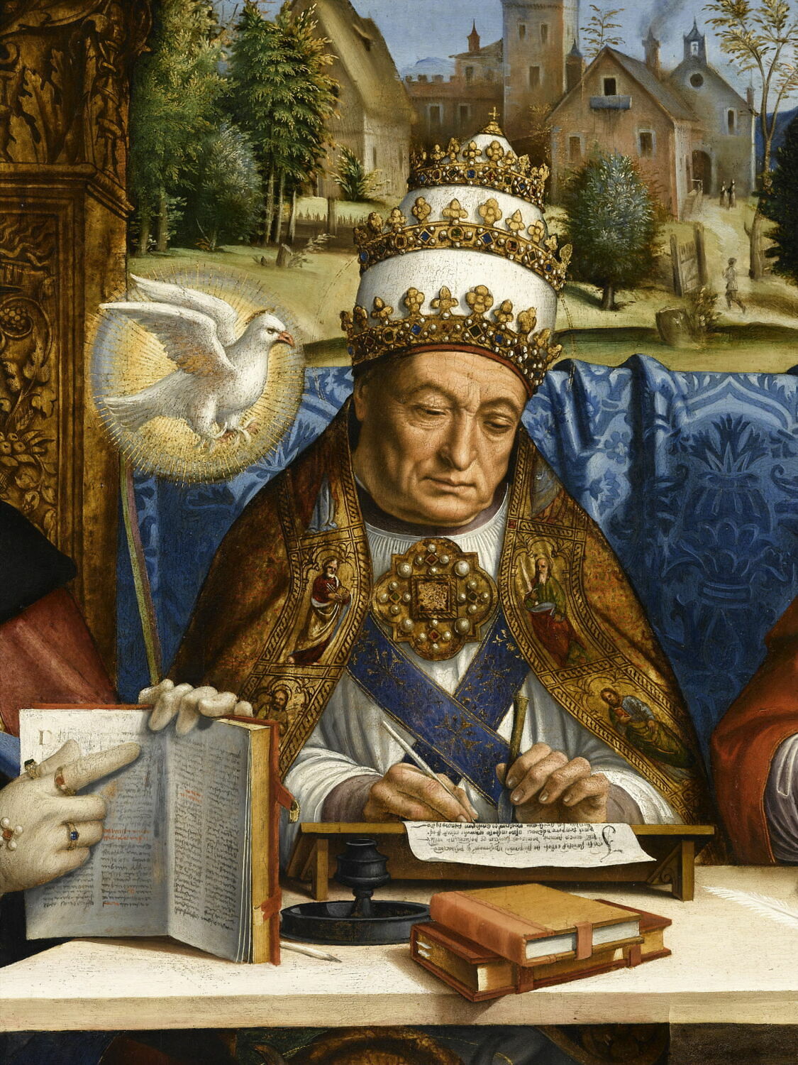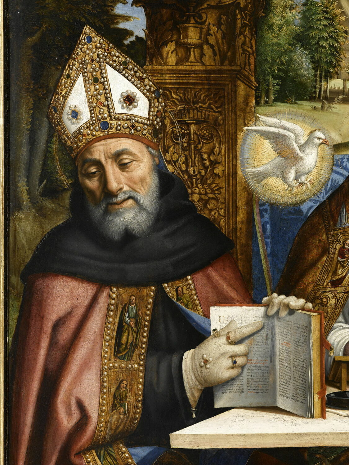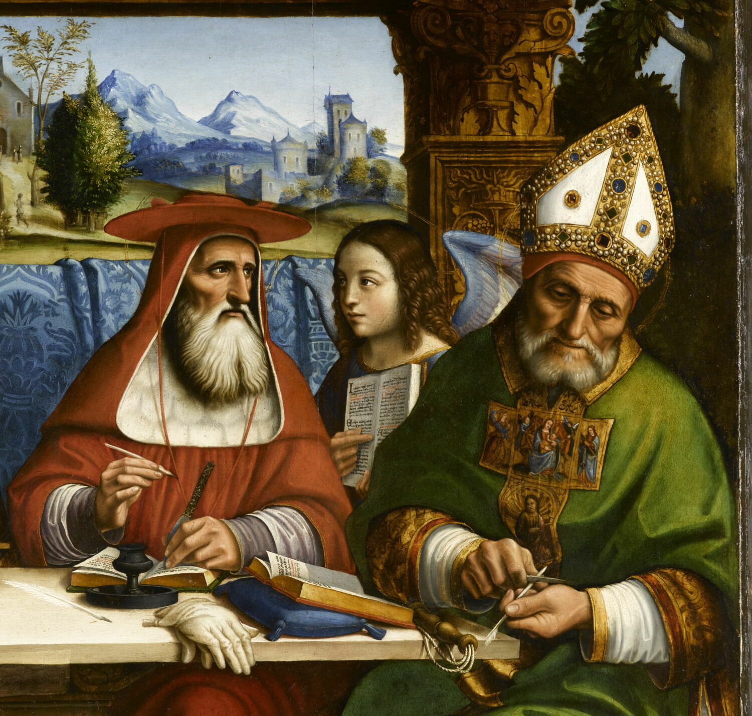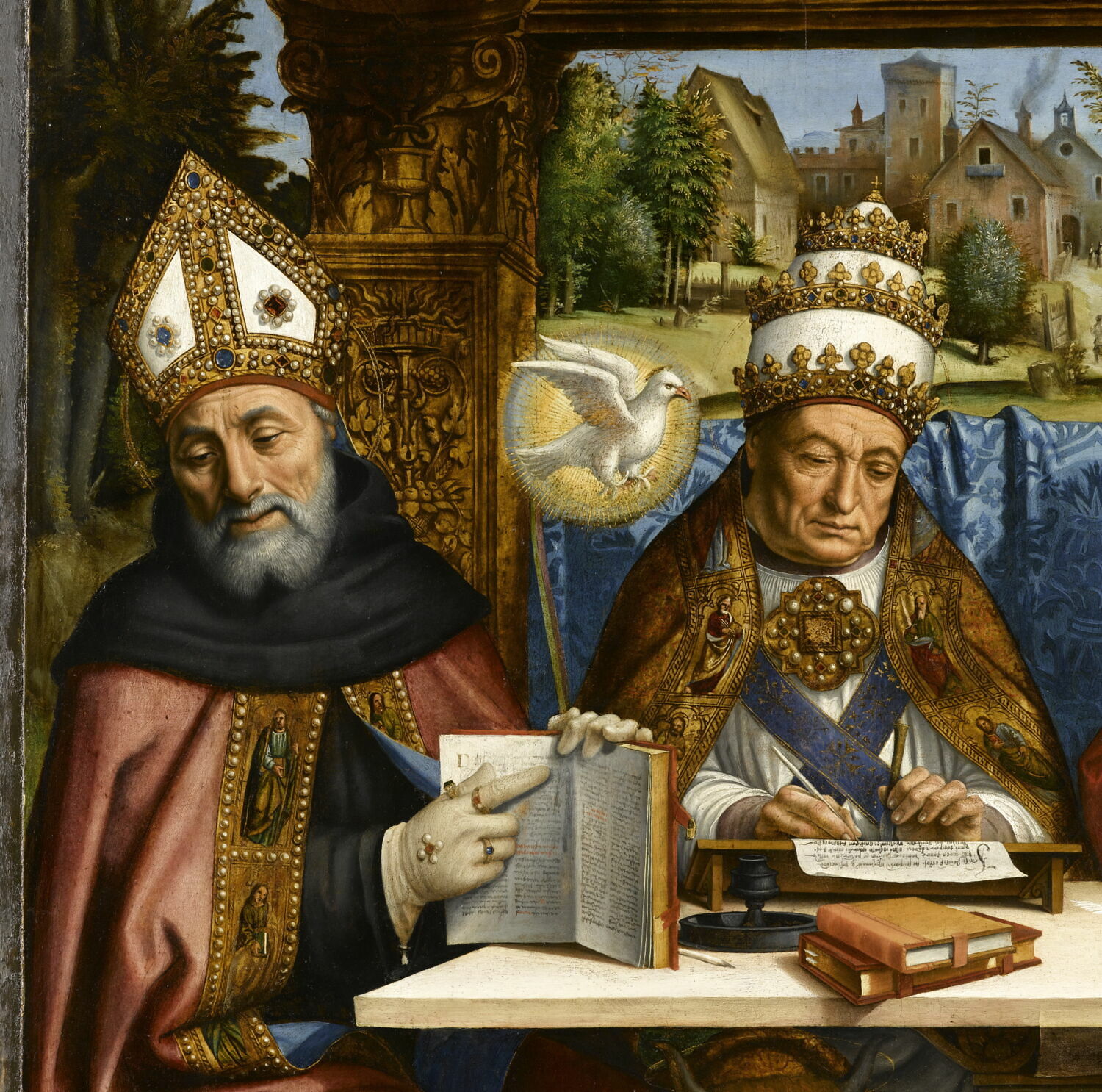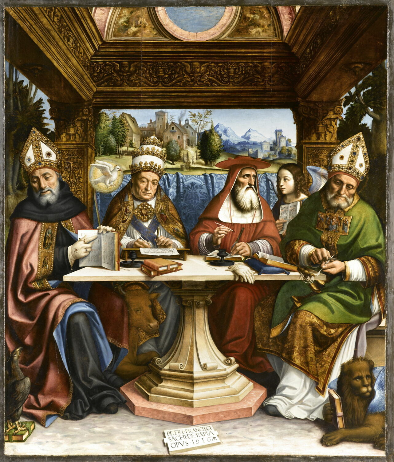 figures (saint Augustin d'Hippone, saint Grégoire Ier, saint Jérôme, saint Ambroise de Milan, assis, fondation : l'Eglise, livre : ouvert, écriture, Le Tétramorphe, table : roche, pape, Saint-Esprit : colombe, intérieur, décor d'architecture) ; fond de paysage (maison, feuillu, colline)