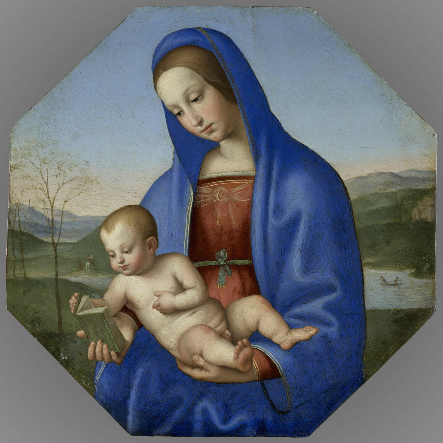 figures bibliques (Vierge à l'Enfant, à mi-corps, assis, Enfant Jésus : nu, livre) ; fond de paysage (colline, cours d'eau, barque, cavalier)
