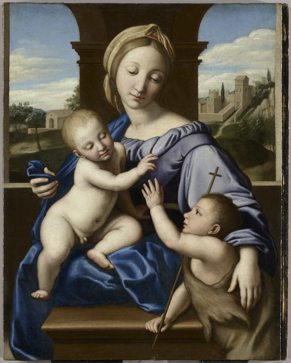 figures bibliques (Vierge à l'Enfant, assis, Enfant Jésus : nu, saint Jean-Baptiste : enfant, loggia) ; fond de paysage (architecture, végétation)