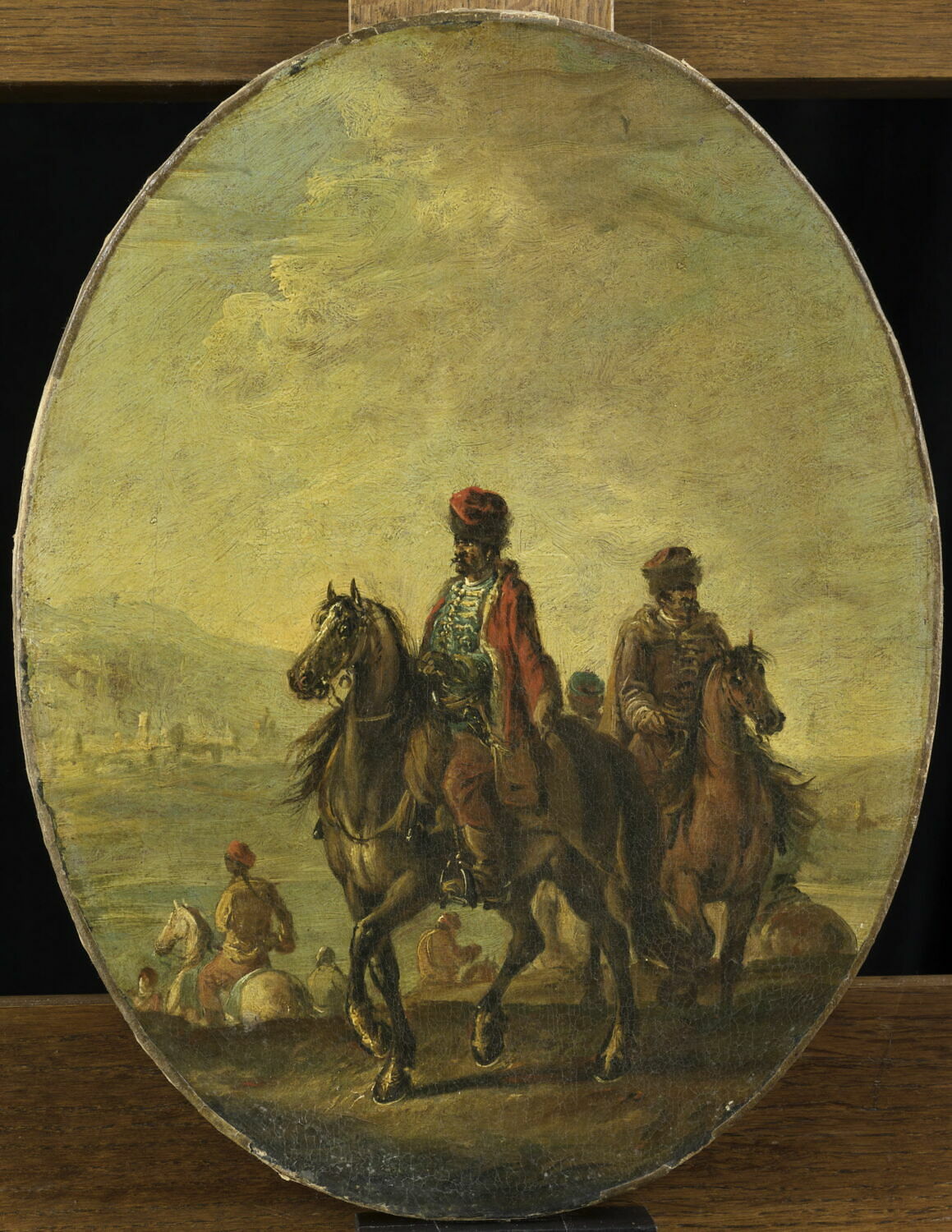 groupe de figures (homme, officier, cavalerie, cavalier, cheval, uniforme, Hongrois) ; fond de paysage