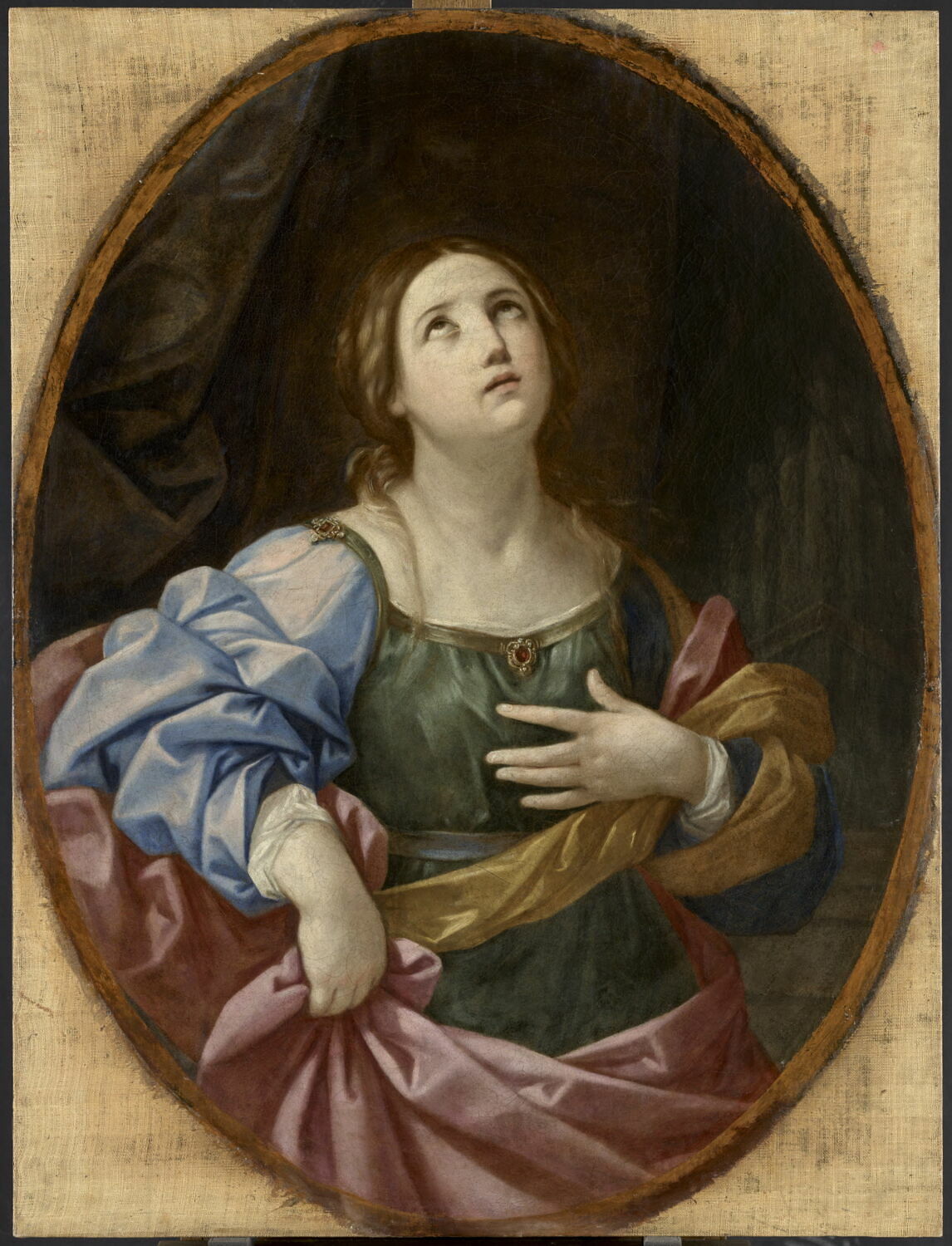 figure (sainte Cécile de Rome, à mi-corps, de face, extase, draperie, orgue, ?)