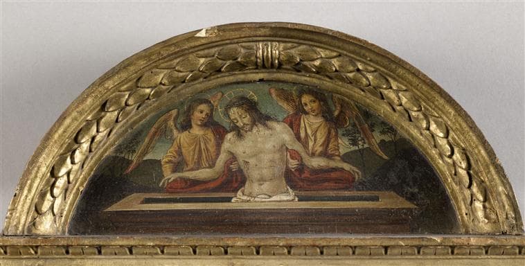 forme un ensemble avec la lunette peinte du cadre ancien également dû à Spagna représentant le christ mort soutenu par deux anges (MI 553)