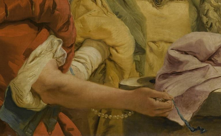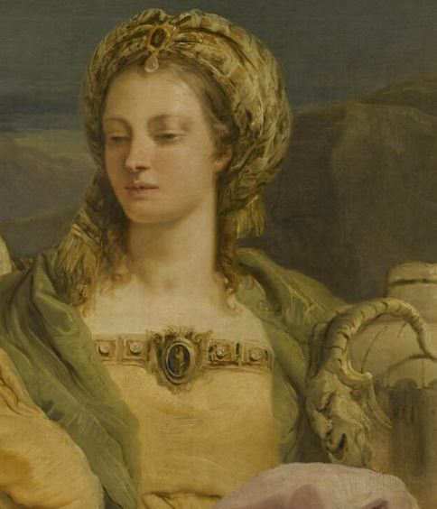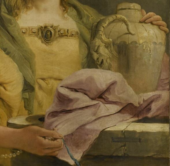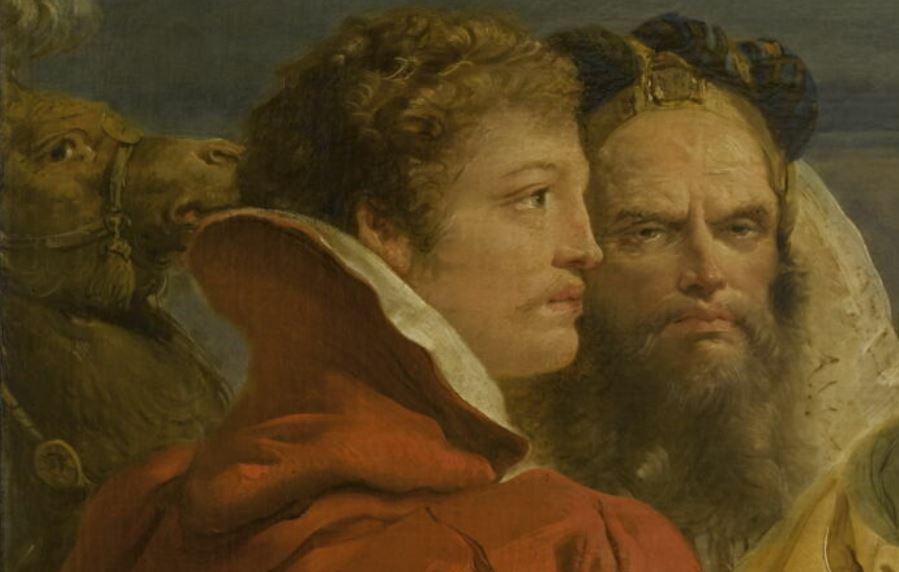 figures bibliques (Eliézer, à mi-corps, de profil, Rébecca, à mi-corps, de face, homme, en buste, puits, pot, chameau : tête)