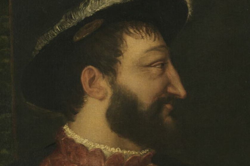 portrait (François Ier, homme, à mi-corps, de profil, chapeau, bijou, barbe, effet de tissu)