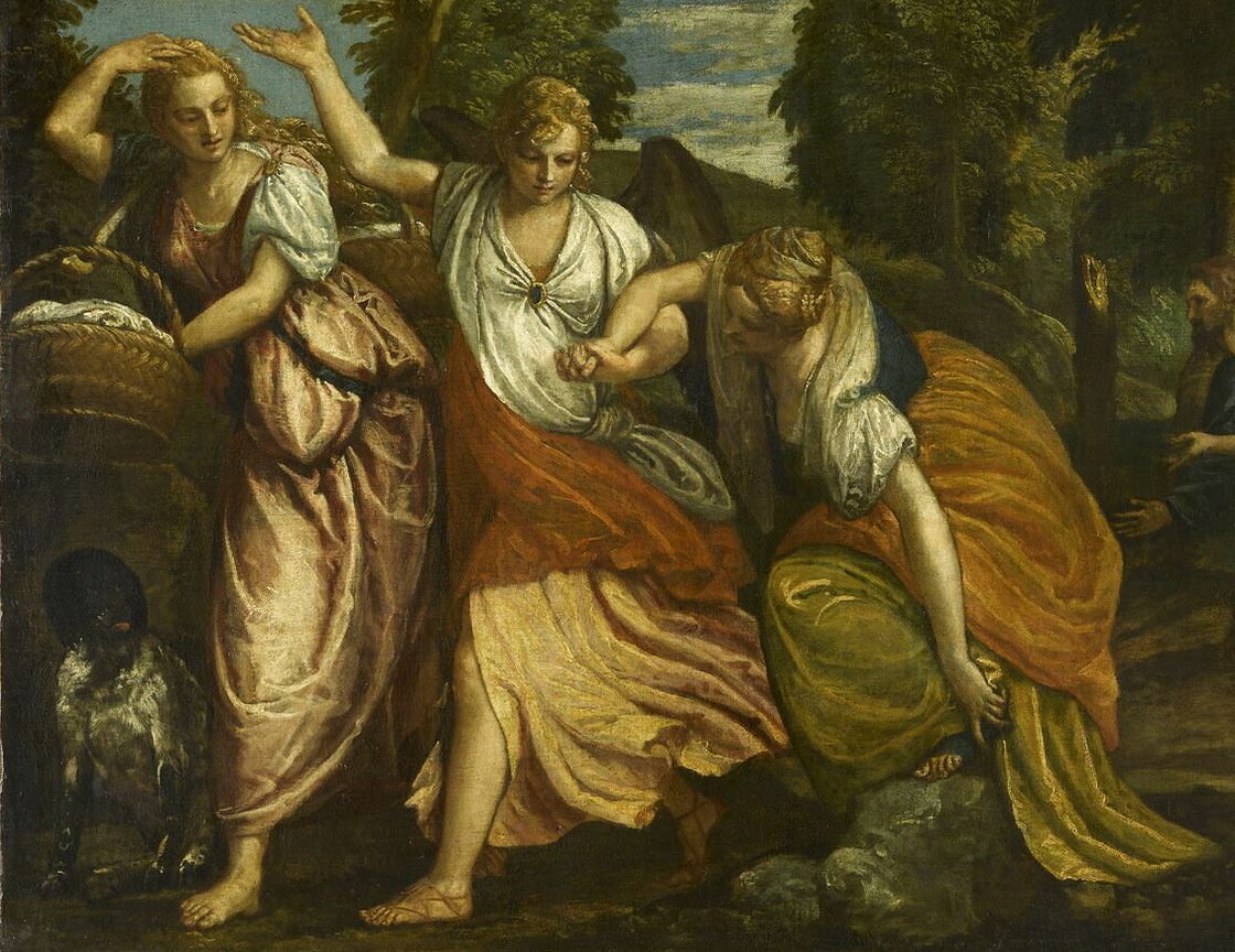 variante exécutée par l'atelier d'après un original de Véronèse daté des années 1580, conservé au Kunsthistorisches Museum de Vienne et appartenant à une série de dix peintures consacrées à l'ancien et au nouveau Testament ; pendant, la fuite des Hébreux hors d'Egypte, conservé au musée des beaux arts de Caen ; gravé par Benoît Audran, par Couché, par Filhol, par Landon en 1832
